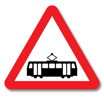 This sign tells you to beware of trams. If you don't usually drive in a town where there are trams, remember to look out for them at junctions and look for tram rails, signs and signals.