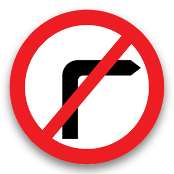 This is often seen at traffic lights and can be showing no right turn (as it is here) or no left turn (in which case the black arrow will be pointing left)
